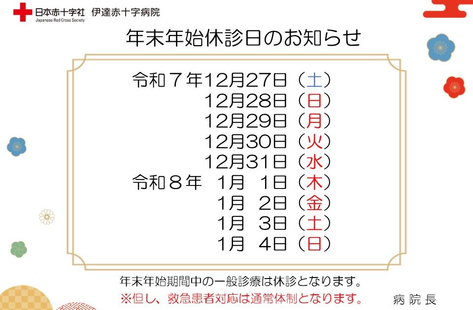 病院からのお知らせ お知らせ 休診のお知らせ 2025/12/1 お知らせ 循環器科小笠原医師「みんなで学ぼう 循環器疾患」のバックナンバーについて 2025/11/26 お知らせ 重要 「電子カルテシステム」導入延期のお知らせ 2025/11/25 お知らせ 重要 一時的な面会禁止のお知らせ 2025/11/25 お知らせ 11月22日(土)室蘭民報に循環器科小笠原医師「みんなで学ぼう 循環器疾患」の記事が掲載されました。 2025/11/25 お知らせ 重要 外来診察室移動のお知らせ(外科・整形外科・呼吸器科) 2025/10/20 お知らせ 年末年始休診日のお知らせ 2025/12/9 お知らせ 整形外科外来における予約・予約変更について 2025/12/1 お知らせ 小児科コロナワクチン接種開始のお知らせ 2025/12/1 一覧はこちら 伊達赤十字病院 病院について こちらをクリック 部門のご案内 こちらをクリック だてクロス バックナンバー こちらをクリック 病院指標 院内がん登録 臨床研究における情報公開 変わらぬ「博愛の精神」と住民に信頼される「地域医療」を目指して 求人情報 人間を救うのは、人間だ。 詳しくはこちらへ LINK author
